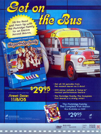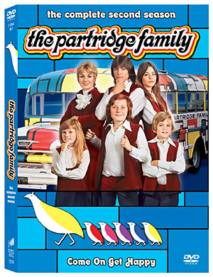 THE COMPLETE SECOND SEASON now available in a Three-Disc DVD Set, with a Special "Jump to" Musical Performances Feature Culver City, CA - Hit the road with television's grooviest family with THE PARTRIDGE FAMILY: THE COMPLETE SECOND SEASON now on DVD from Sony Pictures Home Entertainment. Available for $29.95 SLP, the three-disc set features all 24 second season episodes and a special "jump to" musical performances feature. In September of 1970, The Partridge Family burst onto American television screens in their bell-bottomed pants and matching polyester outfits and cemented their place in pop culture. Loosely based on the career of the real-life family group The Cowsills, The Partridge Family centers on a fatherless family of six who decide to form a rock band and tour the country in their psychedelic-painted school bus. The band's members include mom Shirley (Shirley Jones) and her five kids: oldest son Keith (teen idol David Cassidy), keyboardist Laurie (Susan Dey), bassist and get-rich quick schemer Danny (Danny Bonaduce) and the two youngest Partridges, Chris (Brian Forster) and Tracy (Suzanne Crough). The family's frequently exasperated manager Reuben Kincaid (David Madden) rounds out the cast. The Partridge Family's success crossed over to the pop charts when several Partridge Family songs became genuine hits, including the theme "C'mon, Get Happy," which debuted during this second season, and the number one hit "I Think I Love You." The Partridge Family ran for four seasons on ABC and was nominated for four Golden Globe Awards®, including one for Best Comedy. In the show's second season, Danny worries about losing his singing voice after he's diagnosed with tonsillitis, director Rob Reiner guest stars as a motorcycle hippie named Snake, and Meredith Baxter ("Family Ties") plays a free-spirited millionaire. Other notable second season guest stars include Gordon Jump ("WKRP in Cincinnati"), Norman Fell ("Three's Company") and famed sports announcer Howard Cosell. DVD Special Features Include * "Jump to" Musical Performances Feature Allows viewers to jump directly to musical performances * Digitally Mastered Audio and Video * Full Screen Presentations * Audio: English * Bonus Previews THE PARTRIDGE FAMILY: THE COMPLETE SECOND SEASON features the following episodes: 1. Dora, Dora, Dora 2. In 25 Words Or Less 3. A Man Called Snake 4. The Undergraduate 5. Anatomy of a Tonsil 6. Whatever Happened to Moby Dick? 7. Dr. Jekyll and Mr. Partridge 8. Days of Acne and Roses 9. Tale of Two Hamsters 10. The Forty-Year Itch 11. I Can Get it for You Retail 12. Guess Who's Coming to Drive? 13. Don't Bring Your Guns to Town, Santa 14. Where Do Mermaids Go? 15. Home is Where the Heart Was 16. Fellini, Bergman, and Partridge 17. Waiting for Bolero 18. I Am Curious Partridge 19. My Heart Belongs to a Two-Car Garage 20. Hel-l-l-p 21. Promise Her Anything, But Give Her a Punch 22. The Partridge Papers 23. All's War in Love and Fairs 24. Who is Max Ledbetter and Why is He Saying All Those Horrible Things? Closed Captioned Running Time: approximately 606 minutes DVD Catalog # 12278 UPC Code: 0-43396-12278-9 SLP: $29.95 Enjoy these clips from Season 2!