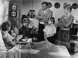 Unfortunately, Reuben comes in with Gloria Neugast, the winner of the contest -- and a 60-year old Jewish mother! In no time at all, Mrs. Neugast is cleaning the house, mowing the lawn, helping the kids with their homework and teaching Laurie how to knit! She even talks Keith into taking her to Muldoon's Point where he takes his girlfriends -- and his friends tease him mercilessly.