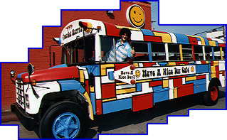 A. After exhaustive research with a highly reliable source, we have uncovered the following...the actual bus lived for years behind Lucy's Tacos on Martin Luther King Blvd, right by USC. When Lucy's repaved their parking lot, circa February 1987, the bus was sent off to a junk yard. It was in horrible shape -- windows broken, tires flat, all identifying type (such as the family name on the side and the "Caution Nervous Mother Driving" sign on the back) was painted over in white and the rest of the bus was miserably faded. So, the upshot is that the orginal bus is long gone. Thanks to Lisa for this info!