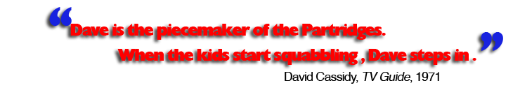 GH: You reunited with Arte Johnson, your co-star from "Laugh-In," in two different "Partridge Family" episodes. Were the two of you still in touch after you left the show? DM: Oh, yeah very much so. As a matter of fact, after Partridge was over, Arte and I did the musical, "A Funny Thing Happened On The Way To The Forum" together at a theater-in-the-round in Milwaukee. He played Pseudolus and I played Hysterium. We had a wonderful time doing that. We had a duet together and his nose about comes up to my navel, which was a funny visual. There again, I'm dressed as a woman - this time a courtesan. There's a song we sing called "I'm Lovely." That was the only time I thought being dressed up like that was actually funny. Only because of the ridiculousness of it, and they were dressing me up to hide me. So there was a good reason for it. And, being in counterpoint with Arte made it funny. And one thing I am not when I dress up as a woman is "lovely." GH: You really shined in "Hel-l-l-l-p!" - the episode where Reuben, Keith and Danny follow Shirley and Laurie as they go camping in the woods. Was that a fun episode to do?