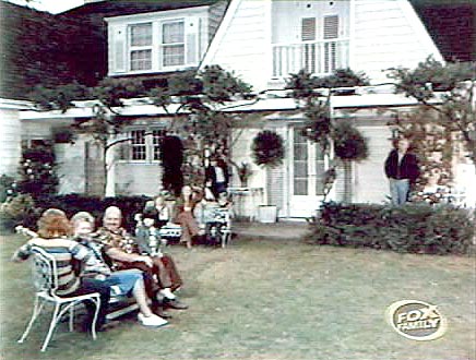 The Partridge back yard. Notice that the back of the house is still painted blue (since it was never seen in the ABC TV movie). This view of the Partridge home was only seen infrequently on "The Partridge Family" in such episodes as when Tracy celebrates her birthday (episode 49) when Snake gets married (episode 54), and the episode below (episode 86).