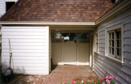 The entryway that leads from the house to the garage. During the Partridge years, the gate was on the other side of the garage, closer to the yard than the driveway.